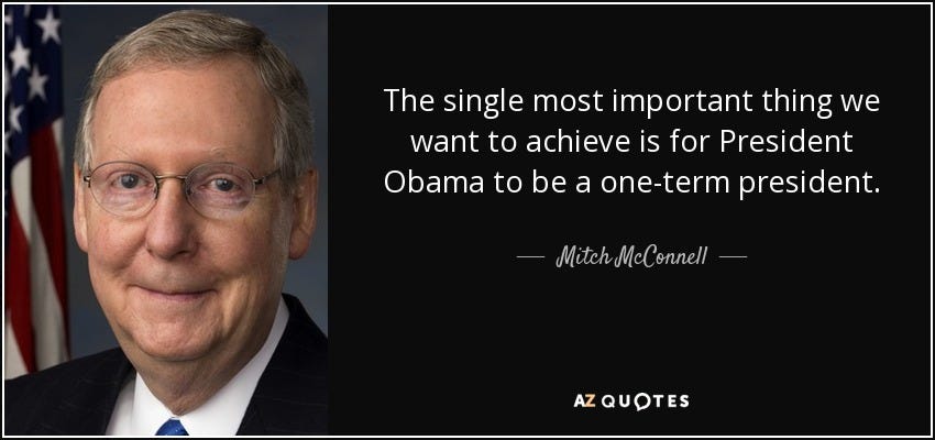 For a year they failed to bamboozle Obama, due to his filibuster-proof majority in the Senate and control of the House. But, Ted Kennedy’s death in 2009 put paid to that and in 2010’s midterm election campaigning Mitch McConnell, the leading Republican figure and head of the Senate Minority, famously said that his one and only goal was “to make the President a 1-term President”. Ouch.