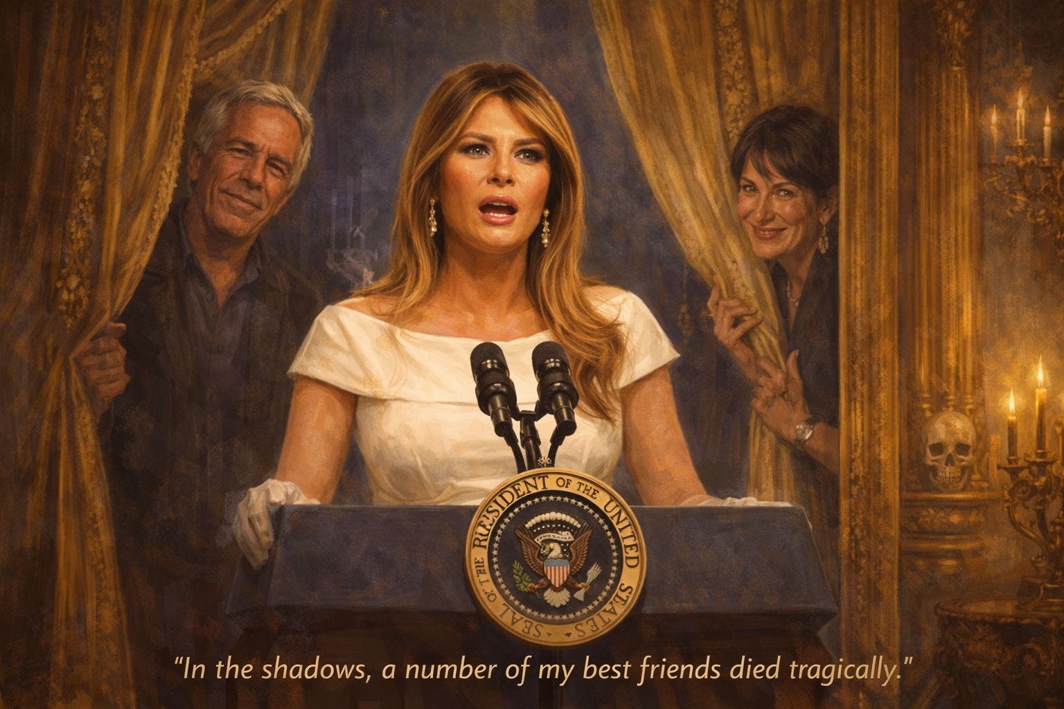 Which brings us to that extraordinary phenomenon unique to the Trump era: no one ever seems entirely certain what anyone is going to say until they are already saying it from a government building. The White House, under Trump, functions less like a seat of executive power than an upscale escape room where staff members frantically try to guess which lever not to pull. Did anyone know what Melania was going to say when they approved the stage, the setting, the choreography of official dignity? Did they imagine restraint, solemnity, some lacquered platitude about nation and family? Or have they simply learned that in this administration, vetting is a superstitious ritual, like knocking on wood before the chandelier falls?