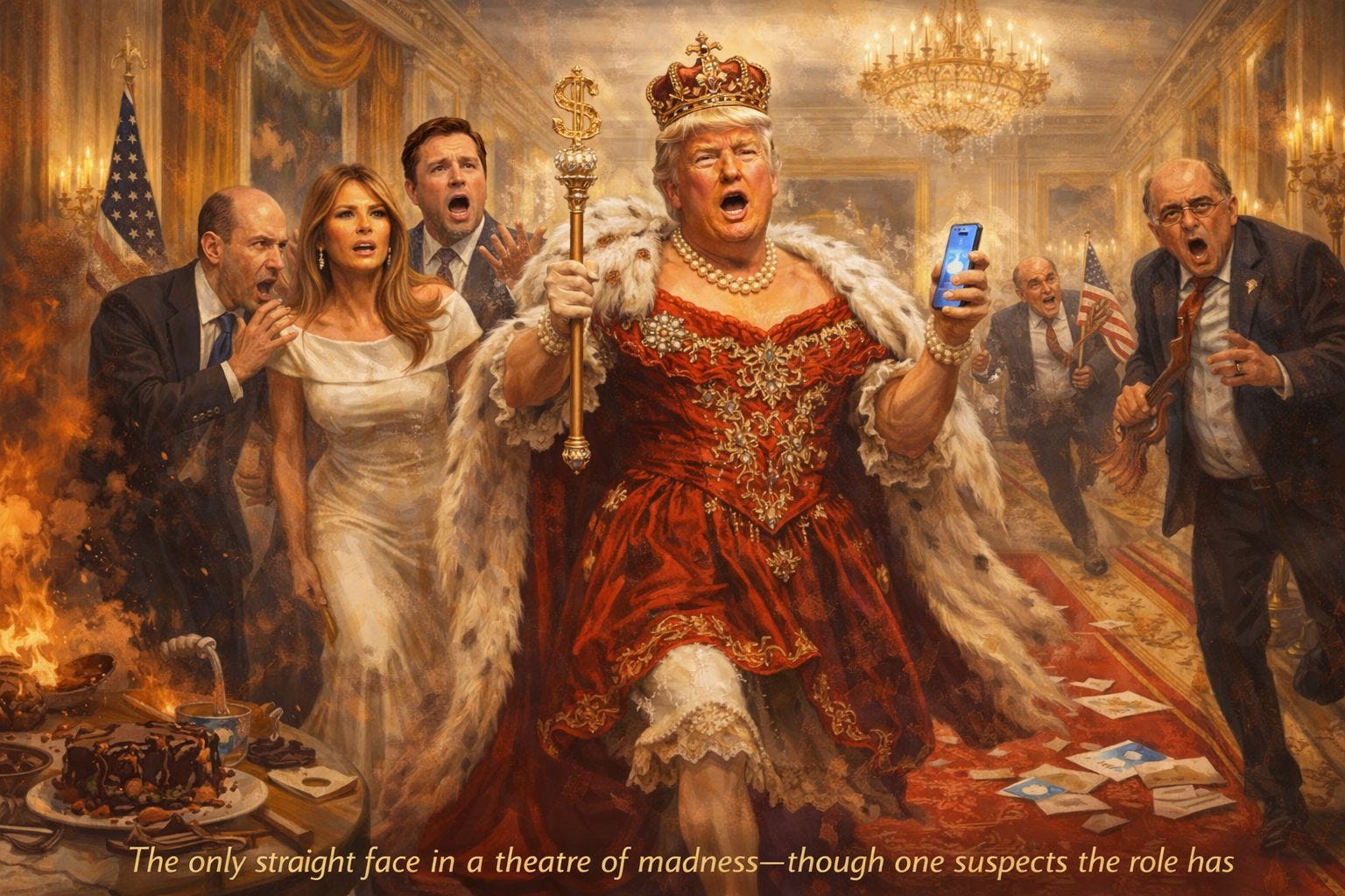 This is the true governing style of Trumpism: not authoritarian precision, as its enemies flatter it, but improvisational monarchy. A court of yes-men, grievance merchants, opportunists, and tense wives, all trapped in a production where the lead refuses rehearsal and regards continuity as an insult. The result is not efficiency but camp panic. Everyone is overacting except the people who are terrified they might.