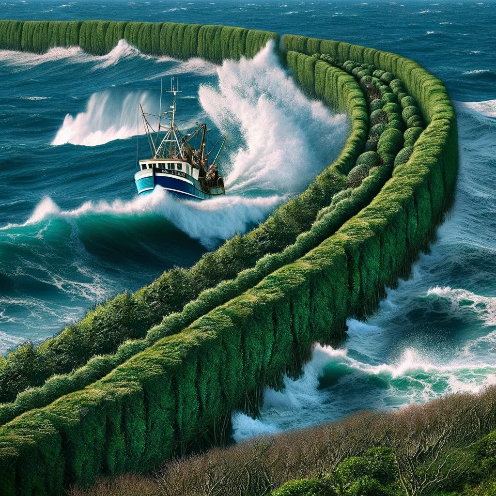 First, though, it seems we need to build a floating hedgerow to get across the Atlantic. Extending this East across the English Channel could also solve the small boats crisis. After all, people would just parkour across the hedge, being welcomed by a nice customs operative at the other end.